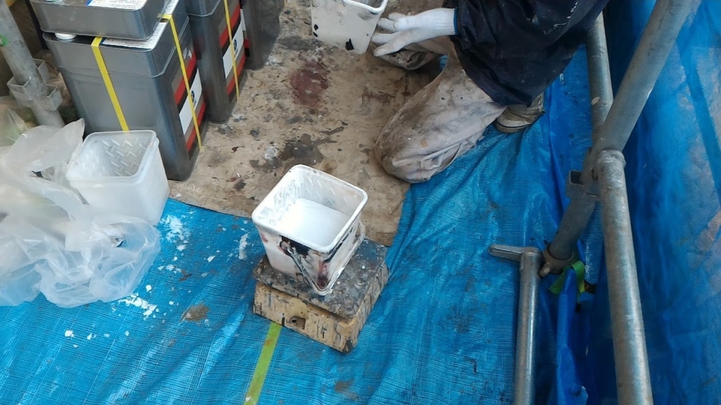 まずは、塗料の配合攪拌から行います。使用塗料「マックスシールド1500F-JY」(旧製品名セラマックス1500F-JY)を配合攪拌します。この塗料の配合比率は(主剤9:硬化剤1)なので、容器に1kg(主剤0.9㎏:硬化剤0.1㎏)を入れて、この塗料の希釈は約5%なので、塗料用シンナーを0.05㎏入れて良く攪拌します。
