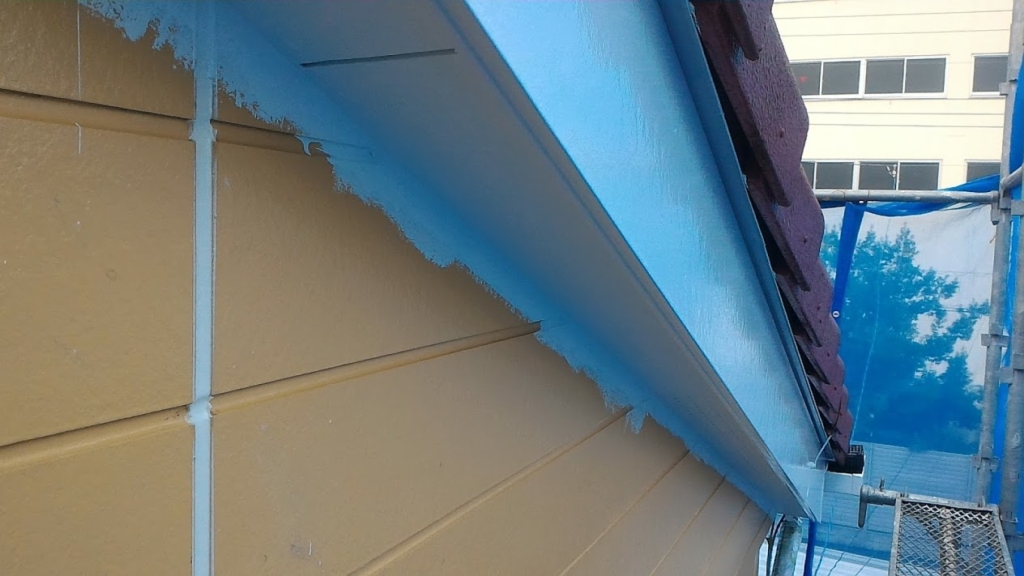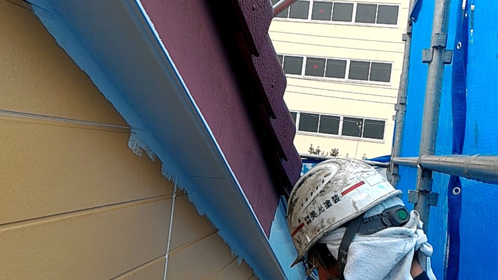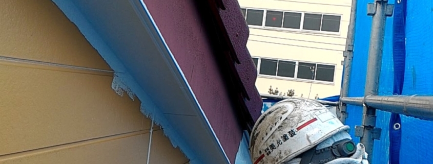 本日の作業予定はまず付帯部塗装(破風板)、外壁の取合い部のマスキング、外壁上塗り1回目塗装の順で行います。