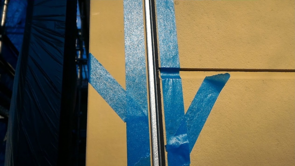 まずは、プライマーをシーリング充填部に塗布し、昨日ゴムパッキンを撤去した伸縮目地部には3面接着を防止するためにボンドブレーカを貼ります。