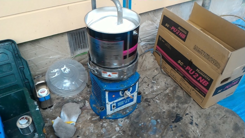 ↑専用攪拌機です。基材・硬化剤の中にパドルを突っ込みスイッチを入れると缶ごとテーブルが洗濯機のように正転逆転を繰り返します。タイマーが付いていて、このシーリング材の場合は15分間以上混合攪拌します。