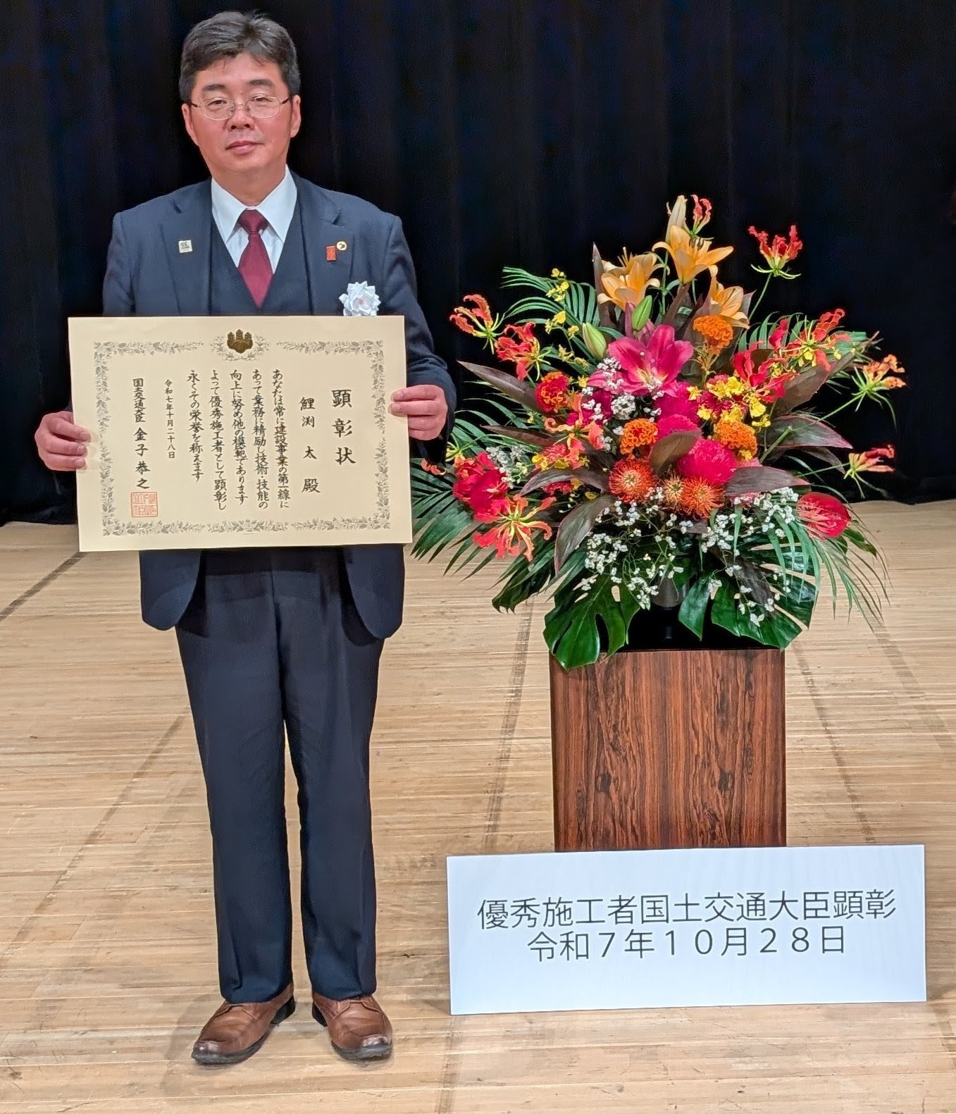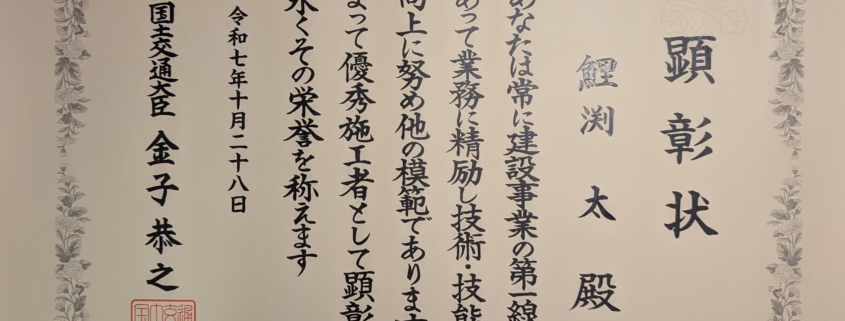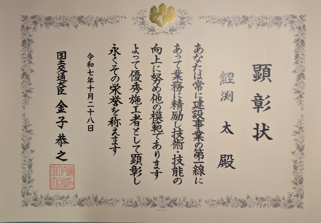 この度、弊社代表取締役 鯉渕 太が、国土交通省より**「優秀施工者国土交通大臣顕彰(通称:建設マスター)」**を受賞したことを、ここにご報告させていただきます。