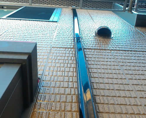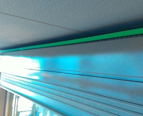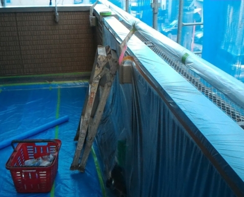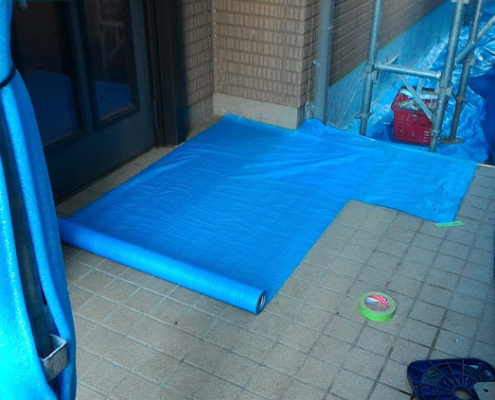 ベランダの床はマスカーではなく、ブルーシートで養生します。マスカー等のビニールで養生すると、脚立などを使用したときに破けてしまう場合があるため、私の場合はブルーシートを敷きます。窓だけでなく、手摺の塗装しない部分(アルミサッシ部)もマスカー・養生用ガムテープを使用して、しっかりと養生します。また、休工日に洗濯物が干せるように物干等も工夫して養生します。